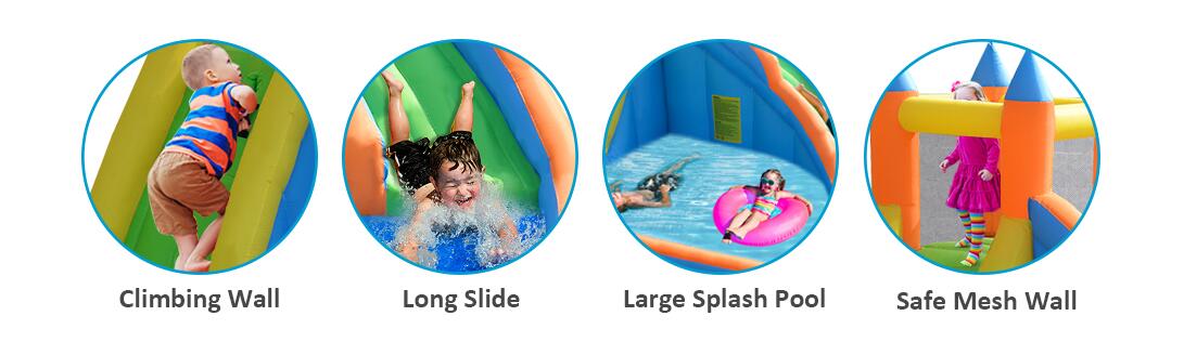 Denne vannsklien i slottet har plaskebasseng, lang sklie og klatrevegg. Tilbyr uendelig moro til barna dine når som helst og hvor som helst. Passer for barn fra 3–10 år, har plass til opptil 4 barn, er laget av slitesterkt og vanntett stoff, er overlegen og trygg. Den store oppblåsbare sklien gir denne hoppesklien en vannsprayfunksjon. Barna dine vil elske å skli ut av hoppesklien og klatre opp igjen.